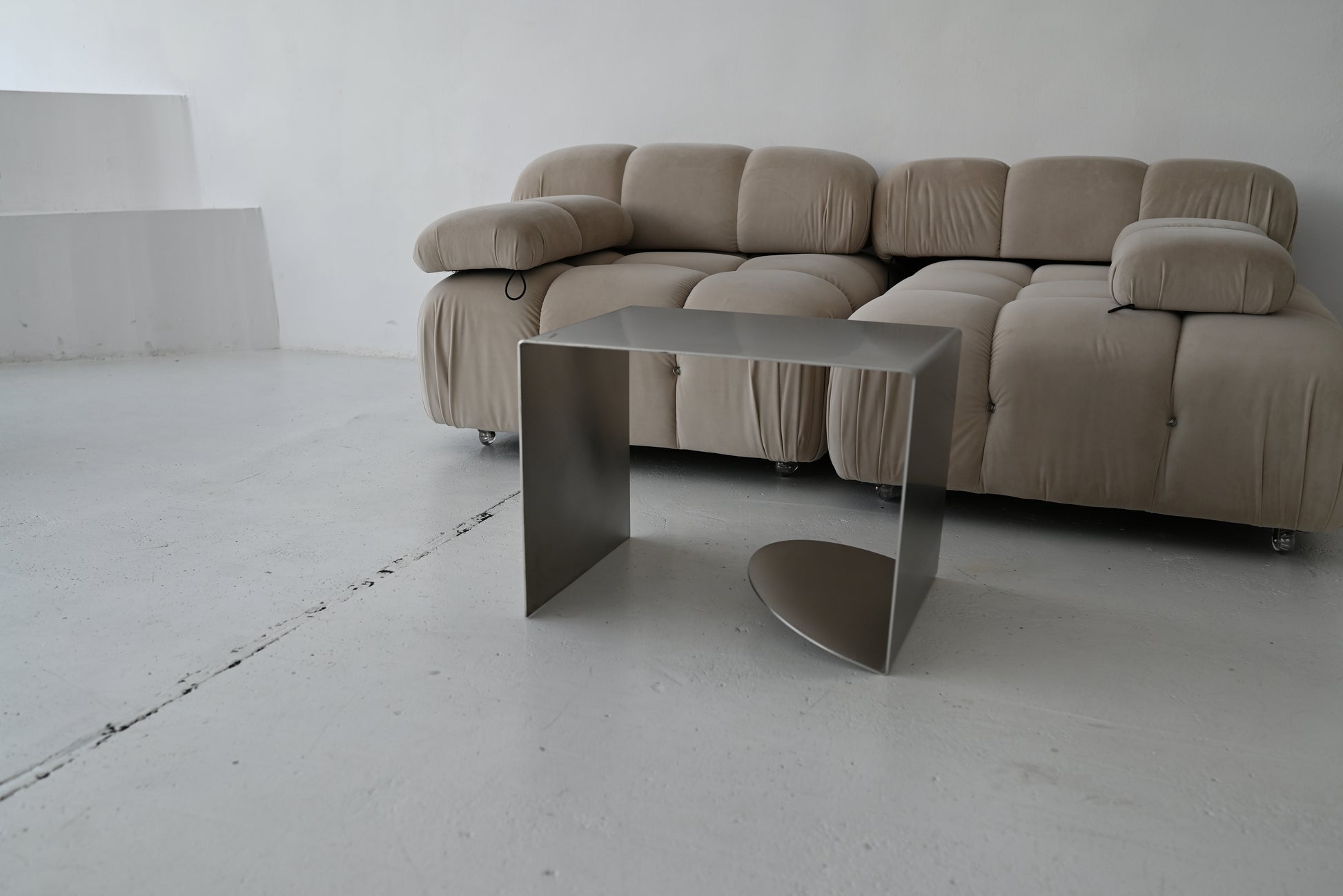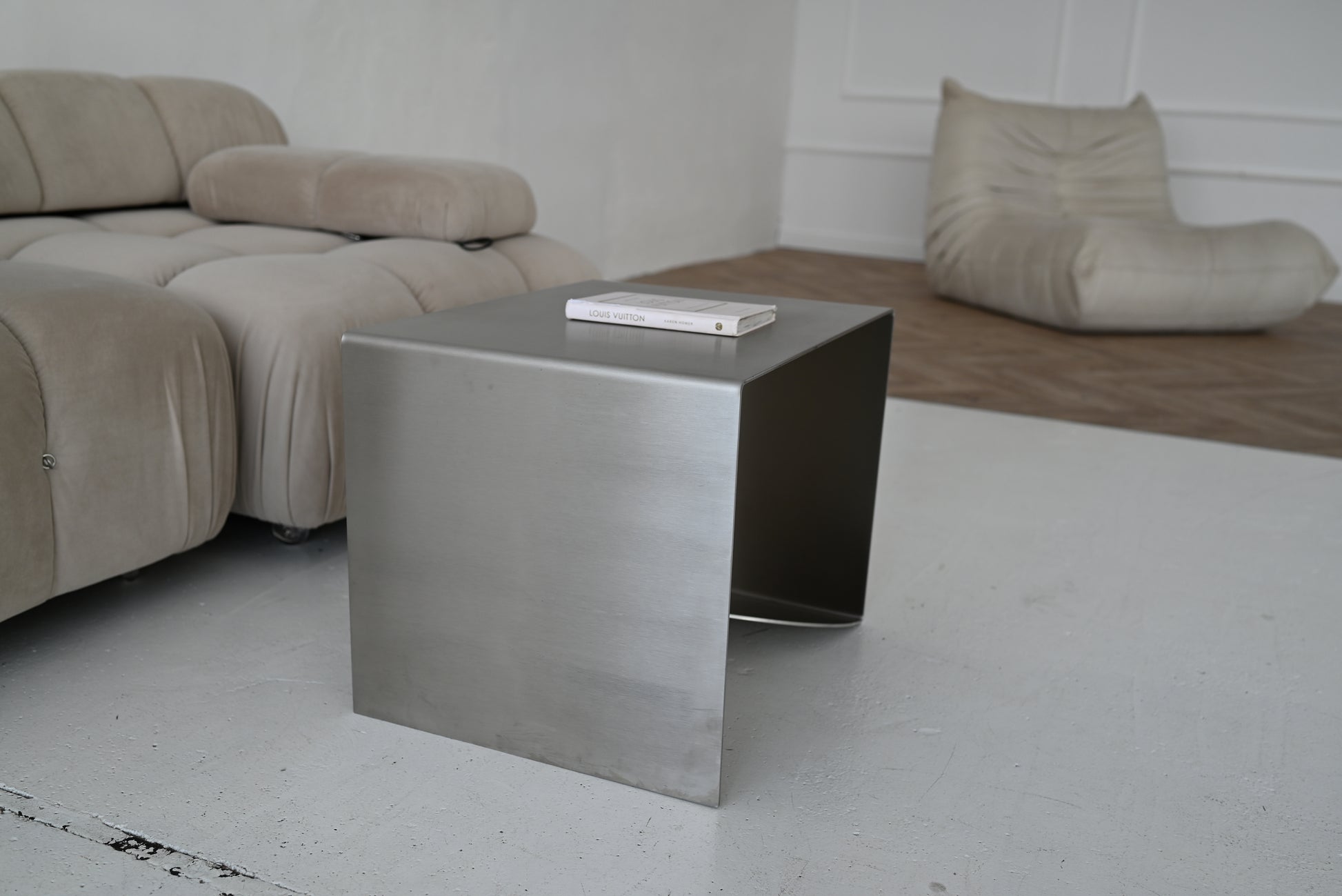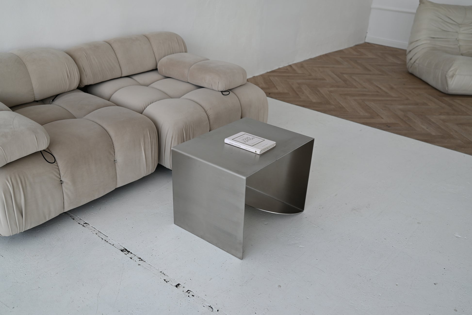 A sculptural, handcrafted side table made from premium 4 mm brushed stainless steel. Minimalist, durable, and timeless – designed to complement modern interiors, lofts, and creative studios.